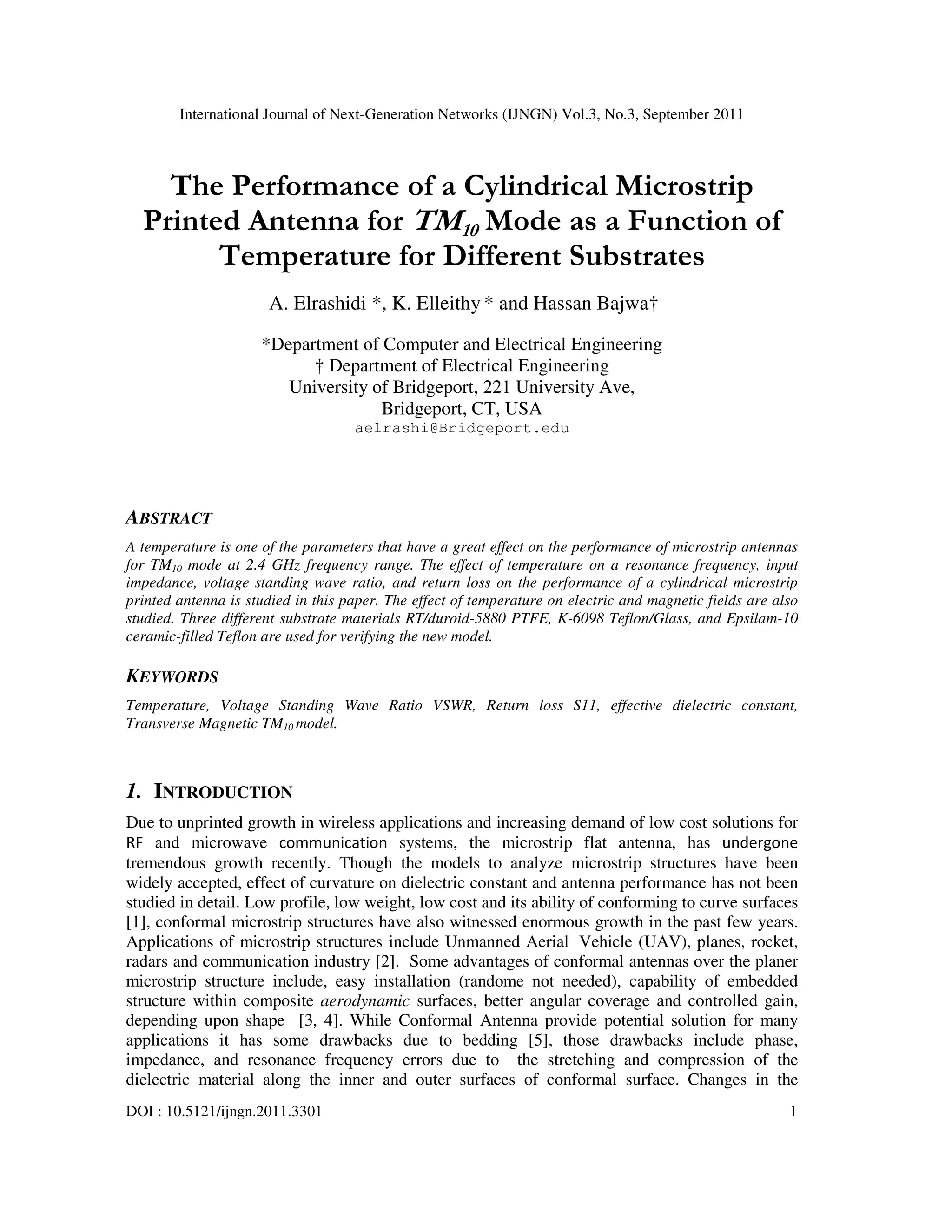 The paper investigates the performance of cylindrical microstrip printed antennas operating in TM10 mode under varying temperatures using different substrates. It highlights how temperature influences key parameters such as resonance frequency, input impedance, and return loss, particularly emphasizing the effects on materials like Teflon and ceramic-filled Teflon. The findings suggest that temperature variations significantly affect antenna performance, making it crucial for their application in environments with temperature fluctuations.