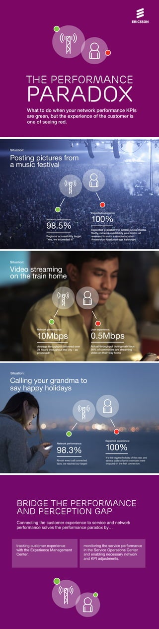 The document discusses the performance paradox in network services, where key performance indicators may indicate success while customer experiences remain negative. It highlights specific examples of mismatched network performance and user experience, emphasizing the need to connect service performance with customer perception. Monitoring tools like the experience management center are essential for addressing these discrepancies and making necessary adjustments.