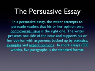 The document provides guidance on writing a persuasive essay. It recommends a 5-paragraph structure, including an introductory paragraph with a thesis statement, 3 body paragraphs with different types of evidence to support the thesis, and a conclusion. It also offers persuasive writing strategies such as presenting opposing views and then refuting them, using transition words to connect ideas, and maintaining an impersonal tone.