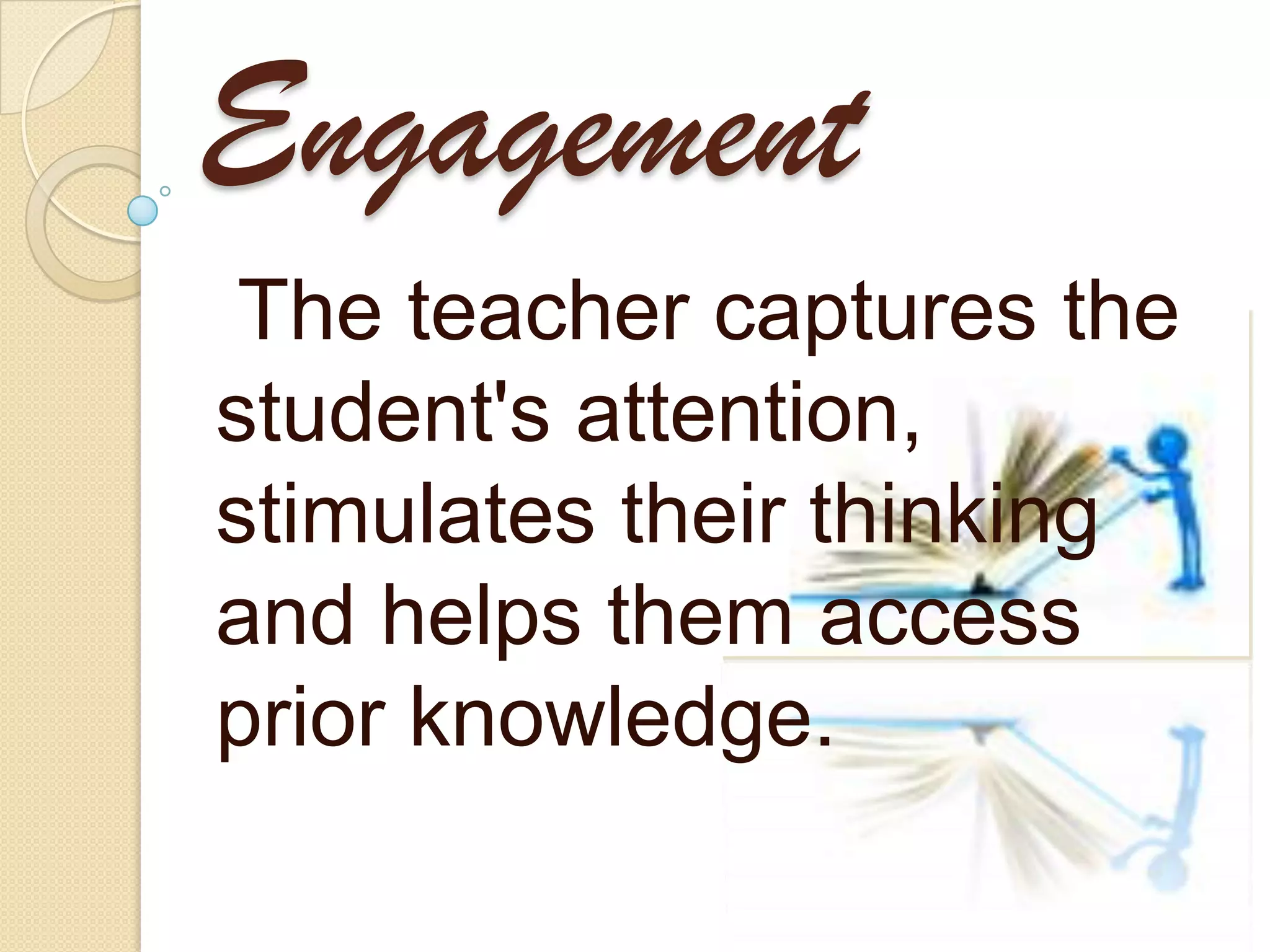 The document outlines 5 phases of instruction: engagement, exploration, explanation, extension, and evaluation. In the engagement phase, teachers capture student attention and access prior knowledge. During exploration, students investigate and organize information. In explanation, students analyze their exploration and modify their understanding with teacher guidance. Extension allows students to expand and apply their learning. Evaluation provides self-assessment and teacher evaluation of students.