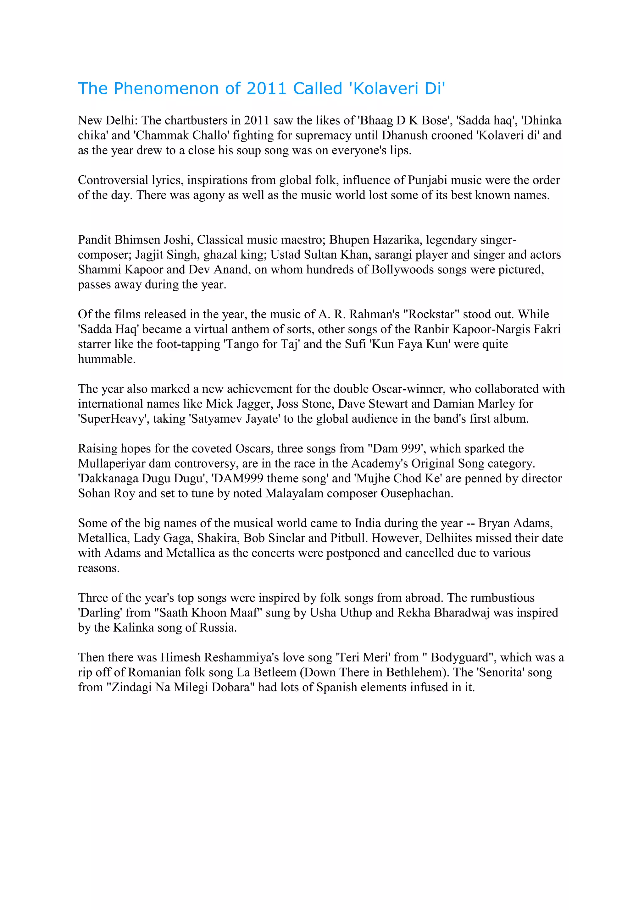 Dhanush's song "Kolaveri Di" became a major hit in 2011 in India, though many other songs like "Bhaag D K Bose", "Sadda haq", "Dhinka chika" and "Chammak Challo" were also popular. The music world lost several legendary artists that year, including Pandit Bhimsen Joshi, Bhupen Hazarika, Jagjit Singh, and Ustad Sultan Khan. A.R. Rahman's music for the film "Rockstar" was particularly praised. The year also saw some international musical acts perform in India.