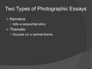 This document discusses the elements that make up an effective photo essay. It explains that a photo essay tells a story through a sequence of photographs rather than words alone. It can have either a narrative or thematic structure. Key elements include a range of high-quality photographs that show both information and emotion, effective ordering, and descriptive captions. The types of photos discussed are lead photos, scenes, portraits, details, and clincher photos. Together, these elements and photo types allow a photo essay to convey its message powerfully through images.