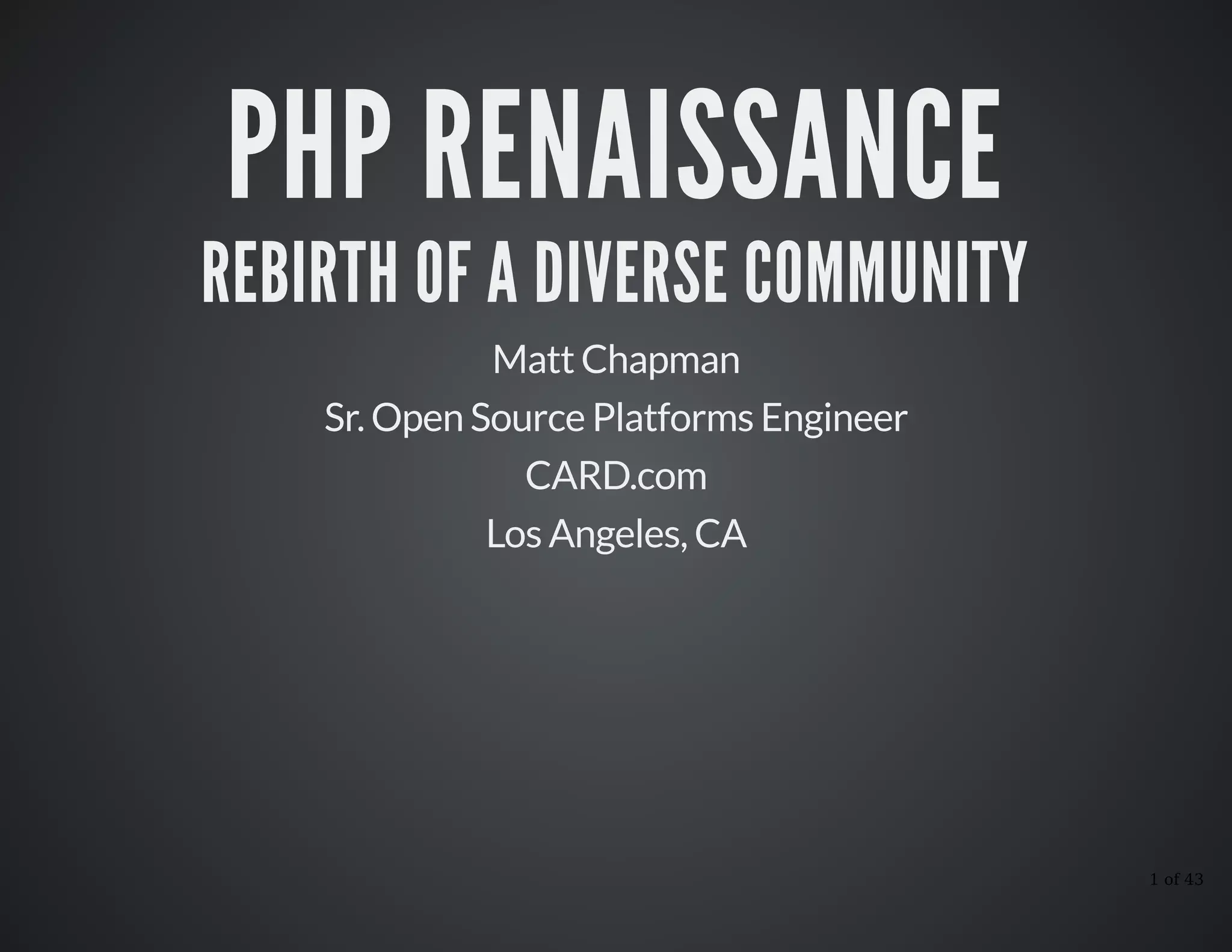 The document discusses the evolution and current state of PHP, highlighting its journey from a basic scripting language to a robust open-source platform with a diverse community. It addresses the historical issues with PHP, the introduction of tools like Composer and GitHub, and various frameworks that have emerged. The importance of community collaboration and the thriving tech job market in Los Angeles are also emphasized.