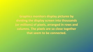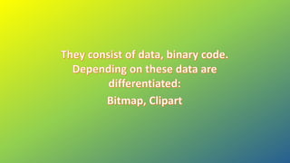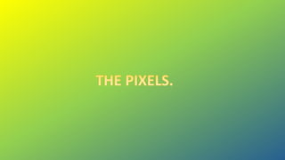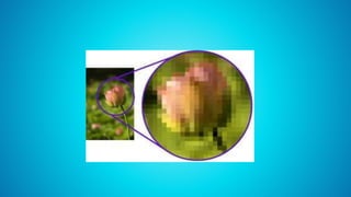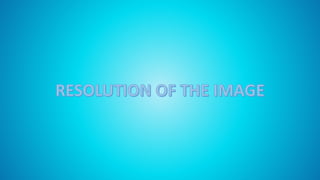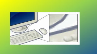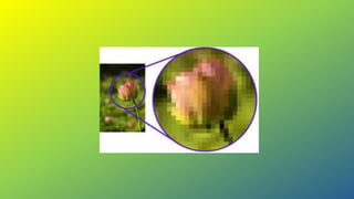 This document discusses the components and properties of digital images. Images are composed of pixels, which are units that define color and brightness values. Together, the set of pixels make up the full picture. Images also consist of vectors, which are mathematical equations that define outlines, fills and other image elements. The resolution of an image indicates how much detail it can display, with higher resolution images appearing sharper than conventional photography.
