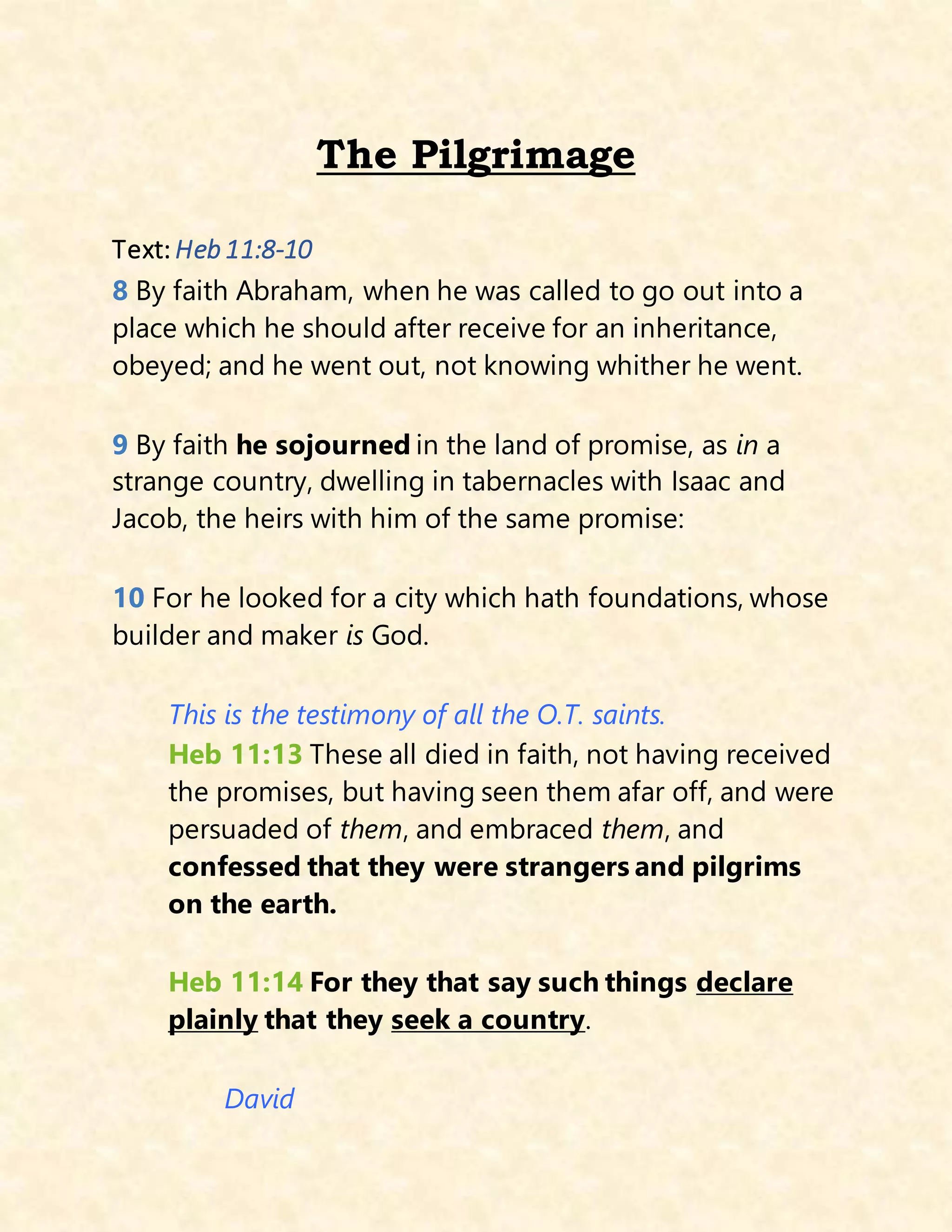 The document discusses the concept of spiritual pilgrimage as illustrated by Abraham's faith in Hebrews 11:8-10, highlighting his obedience to God's call and longing for a heavenly city. It emphasizes themes of faith, the acknowledgment of sin, and the pursuit of spiritual goals, urging readers to live as 'strangers and pilgrims' while seeking a divine promise. Throughout, references to scripture reinforce the importance of faith in navigating life's journey towards eternal life with God.