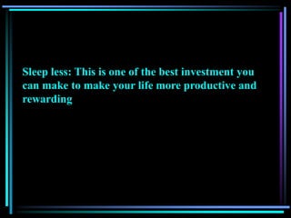 This document provides tips for developing self-mastery through establishing daily habits and routines. Some key recommendations include: setting aside one hour each morning for personal development activities like meditation; laughing for five minutes daily; focusing the mind by counting steps while walking; exercising willpower by delaying meals or resisting breaks during difficult tasks; spending time in nature; reading biographies of leaders; and recognizing the power of mantras and positive self-talk. The overall message is that establishing consistent practices can help cultivate focus, discipline, health and personal growth.