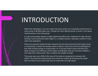 This document summarizes a pistonless pump designed for rocket fuel. It introduces the pistonless pump as an alternative to turbo pumps that is simpler, cheaper, and lighter. The summary describes how the pistonless pump works using pressurized gas to cycle fuel through two chambers alternately without any moving pistons. Advantages are listed as low cost, weight, and few moving parts compared to turbo pumps. Applications mentioned include use in deep space exploration missions.