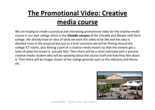 The group will create a promotional video for the creative media course at their college. They have drafted a proposal and storyboards. Next steps include filming around the college, interviewing a current student, and editing the video together. Their goal is to inform both current and prospective students about the course in an interesting way.