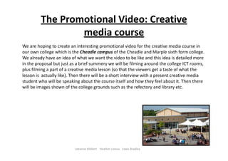 The document provides information about a promotional video being created by Leeanne Hibbert, Heather Lomas, and Lewis Bradley for a creative media course. It includes sections on the proposal, project schedule, target audience, budget, personnel requirements, their team, and two storyboard pages. The group plans to film around the college ICT rooms and a creative media lesson, interview a current student, and show images of the college grounds to promote the course for future and present students.