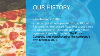The Pizza Company was established in Thailand in 2001 after its agreement with Pizza Hut was terminated. It is now the largest pizza chain in Thailand with over 200 restaurants. The Pizza Company began franchising internationally in 2004 and now has locations in 19 countries across Asia, the Middle East, and Africa. It offers a variety of pizzas and appetizers with over 30 toppings to choose from. Customers can order online or by phone for delivery.