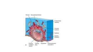 The document discusses the development and functions of the placenta and membranes during early pregnancy, highlighting the formation of the extraembryonic circulation, the roles of chorionic structures, and the processes involved in uterine attachment and growth. It details how the placenta evolves in size and function, including roles in nutrient exchange and hormone production, while also addressing twin pregnancies and potential complications like preeclampsia and placenta previa. The amniotic fluid's functions, along with the structure and changes of the umbilical cord, are also explained.