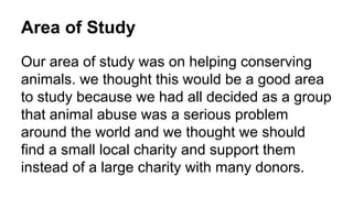 The group decided to help the local Sai Kung Stray Friends charity that helps save stray dogs. Their project focuses on raising awareness and doing small tasks like walking and feeding dogs. Their main audience is the Hong Kong population, especially Island School students and Sai Kung residents, hoping to gain their support and donations. They also believe the charity supports people of any culture or background.