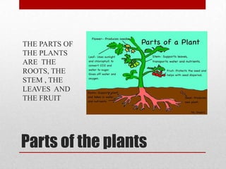 The document discusses the key parts of plants including the roots, stem, leaves, and fruit. It also explains that photosynthesis is the process where plants turn carbon dioxide into oxygen. Finally, it states that plants need sunlight, nutrients, water, and soil in order to grow.