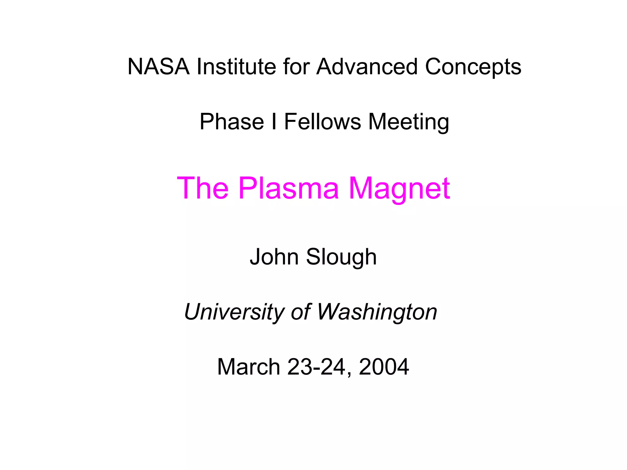 The document summarizes research on a proposed plasma magnet propulsion concept. Key points: