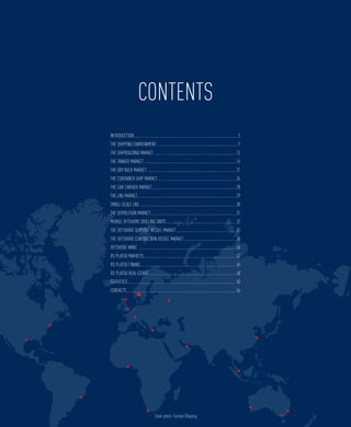 The document provides an overview of the global shipping and offshore markets in 2013. It discusses trends in various shipping segments including tankers, dry bulk carriers, container ships, car carriers, and LNG carriers. The offshore section covers mobile offshore drilling units, offshore support vessels, and offshore construction vessels. Key points include another year of high fleet growth outpacing tonnage demand growth, declining freight rates and asset values across most shipping segments, and signs of recovery in the LNG and offshore markets. Overall, the markets remained challenging in 2013 but showed potential for recovery in 2014-2015 as the global economy improves and fleet growth moderates.