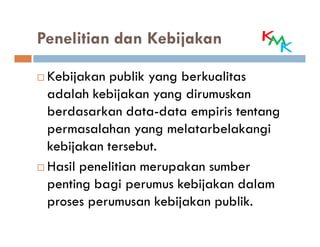 Policy brief ini membahas tentang pentingnya penelitian dalam proses perumusan kebijakan publik yang berkualitas. Ada beberapa kendala dalam memanfaatkan hasil penelitian antara lain adanya gap besar antara peneliti dan pembuat kebijakan, hasil penelitian yang kurang jelas, dan ketidaksesuaian waktu antara penelitian dan proses kebijakan. Policy brief dapat menjadi solusi untuk mengatasi kendala tersebut karena b