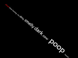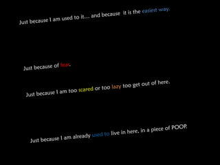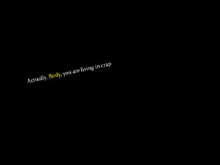 The document tells a story about a bird named Birdy who hides from a cat named Tom in a large piece of cow poop. Though living in poop provides Birdy with food and safety, it also means living in darkness and with a bad smell. Birdy eventually decides to leave the poop and face his fears of Tom, believing he can defeat the cat and pursue his dreams of traveling, finding love, and eating seeds in open fields. The story encourages readers to confront their own fears rather than hiding from them.