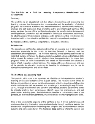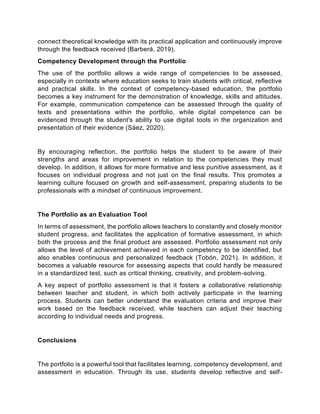 The portfolio is an educational tool that documents learning processes, develops competencies, and facilitates continuous assessment. Its use promotes active learning, self-reflection, and personalized evaluation, enhancing students' analytical and critical skills. Despite some challenges, incorporating portfolios in education fosters a more integrative and student-centered approach that prepares learners for contemporary challenges.