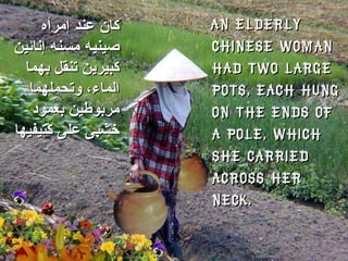 تتناول القصة حكمة صينية تتعلق بامرأة مسنّة تحمل إنائين من الماء، أحدهما شرخ والآخر سليم. على الرغم من شعور الإناء المشروخ بالخجل بسبب عدم كماله، إلا أن المرأة تراه كجزء من جمال الطبيعة، حيث زرعت زهورًا على جانب الإناء المشروخ. تُظهر القصة أن لدينا جميعًا عيوبًا، ولكن يمكن لهذه العيوب أن تساهم في جمالية الحياة.