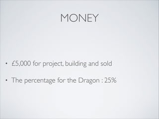 The document discusses a POW (pattini on water/water skates) project including acquiring £5,000 for building and selling the product. The Dragon investor will receive 25% percentage. The POW allows users to go on water without getting wet and is fun. Young, athletic men will rent the POWs on a lake for £100 or purchase new ones for £500. The POWs will be built in a factory in Italy. The first customers will be Matteo Pastore and his friends.