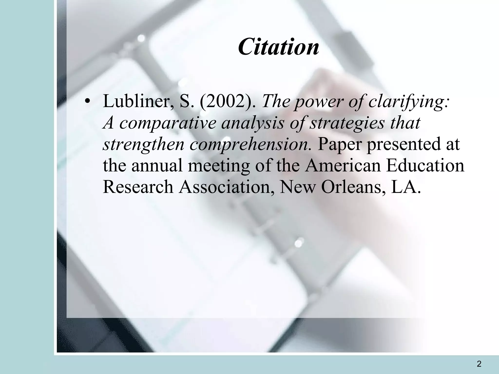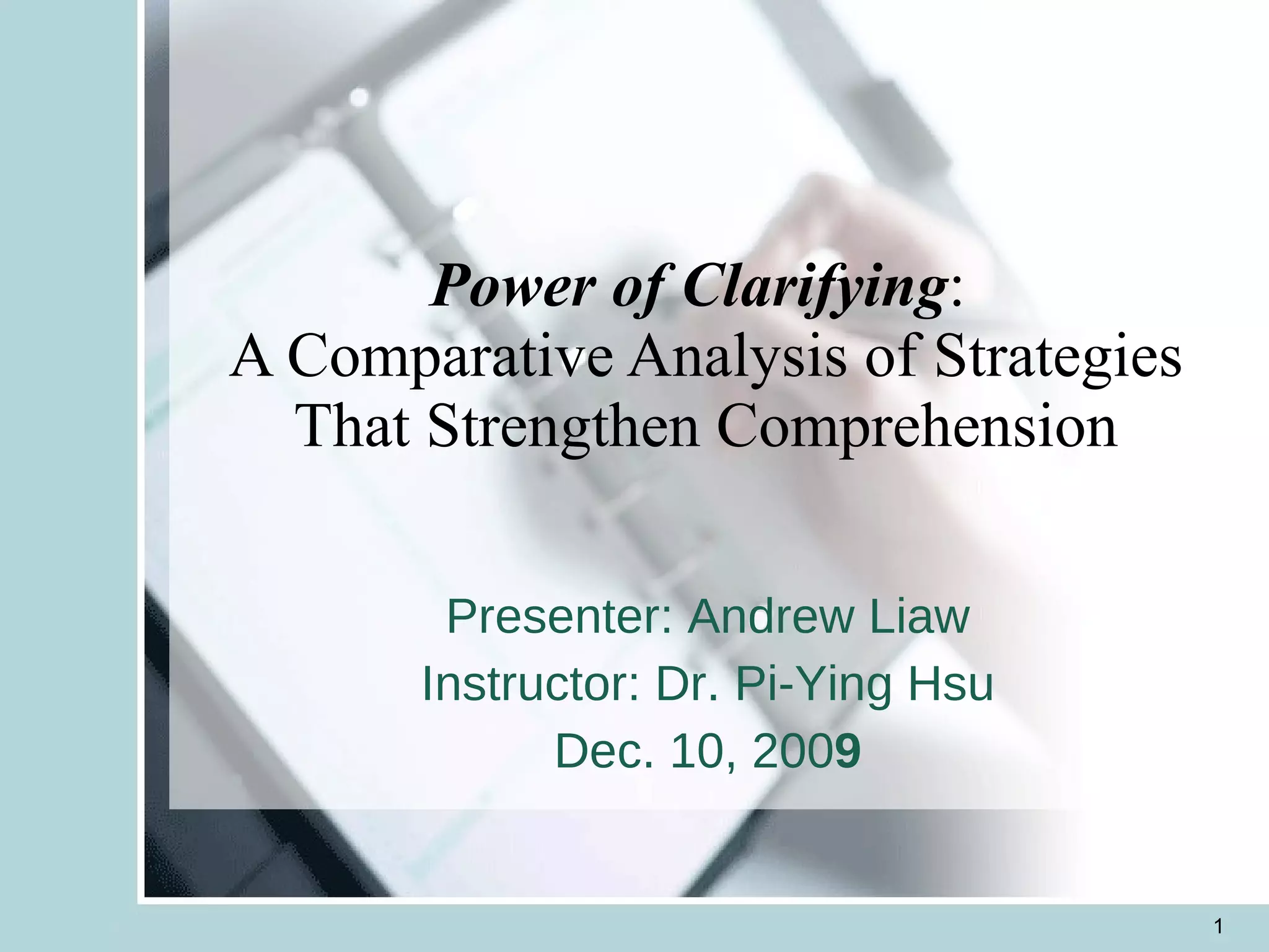 This document summarizes a study that compared the effectiveness of questioning, clarifying, and a combination strategy on reading comprehension. The study involved 193 students in questioning, clarifying, combination, and control groups. Tests were administered pre- and post-instruction to measure reading comprehension and vocabulary. Results indicated that the clarifying group scored highest on reading comprehension and vocabulary tests. The combination strategy was also effective, while questioning was most beneficial for higher-proficiency students. The study demonstrates that clarifying instruction can improve comprehension.