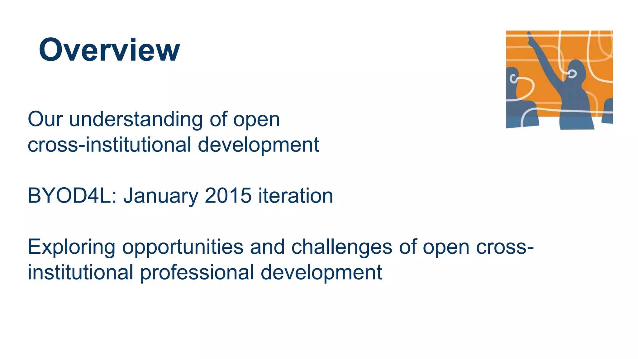 The document discusses the collaborative initiative called BYOD4L, focusing on the benefits and challenges of open cross-institutional professional development in higher education. It includes findings from research conducted with various institutions, showcasing participant expectations, strengths, weaknesses, and recommendations for effective engagement. Additionally, it outlines preparations for future iterations and emphasizes the importance of collaboration and institutional support in enhancing professional development opportunities.