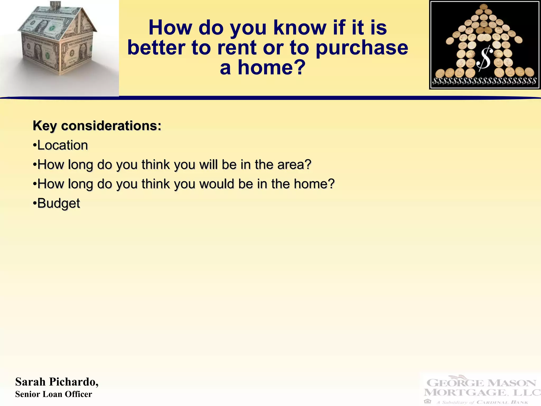 The document compares the financial considerations of renting versus buying a home. Key factors in the decision include location, anticipated length of stay, and budget. Buying a home offers tax benefits like deducting mortgage interest and property taxes. It also allows building equity over time as the home appreciates in value. However, buying requires a larger initial investment for a down payment and closing costs. The document uses an example in Centreville, VA to show how buying could save over $16,000 per year compared to renting after accounting for tax benefits and home appreciation. It provides resources for calculating the rent vs buy analysis and describes various loan programs like FHA that offer lower down payment options.