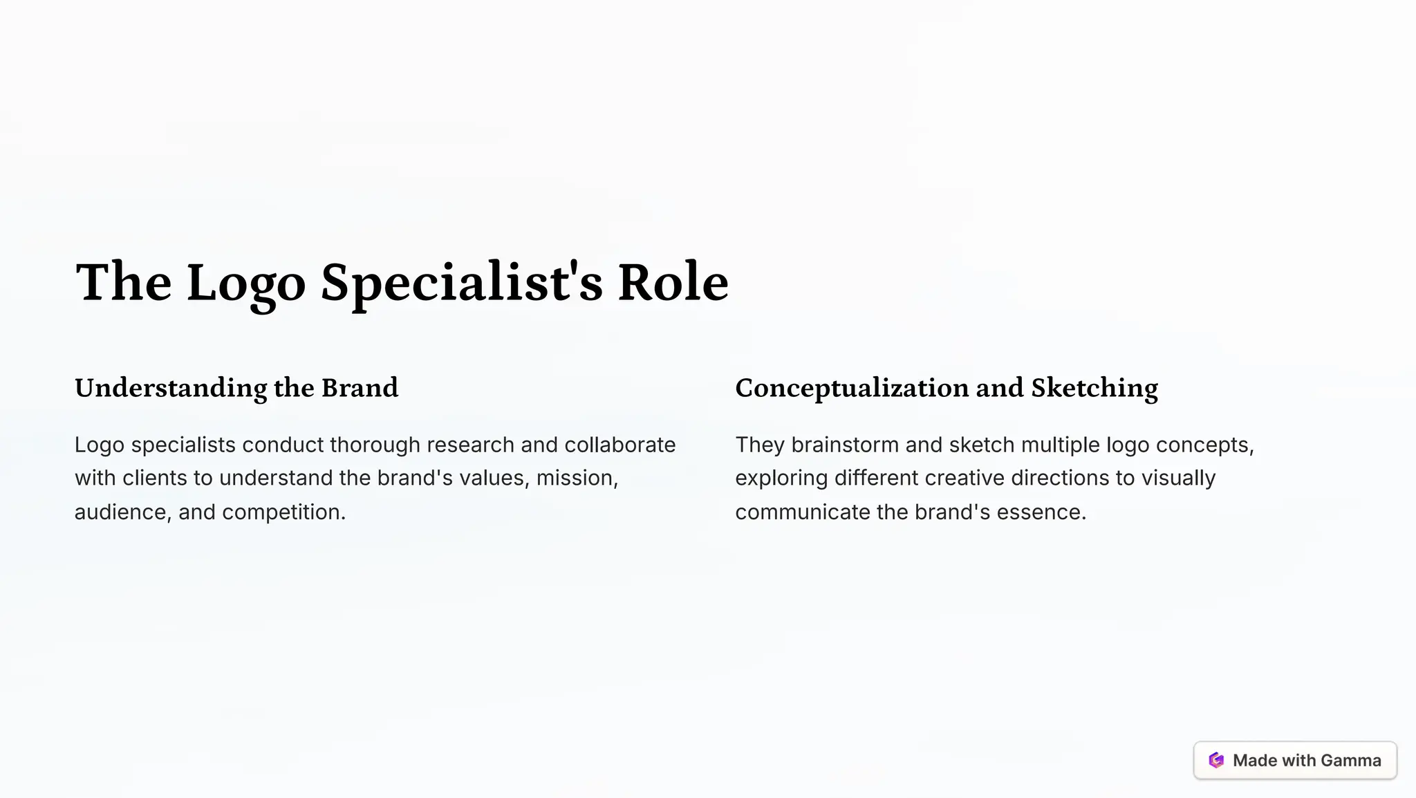 Logo specialists and graphic designers are essential in creating a brand's visual identity, helping to establish recognition, trust, and emotional connections with audiences. They conduct research, conceptualize logo designs, and provide usage guidelines while also creating comprehensive visual branding elements and marketing materials. Effective design fosters brand loyalty and advocacy, demonstrating the importance of creativity, communication, and attention to detail in the branding process.