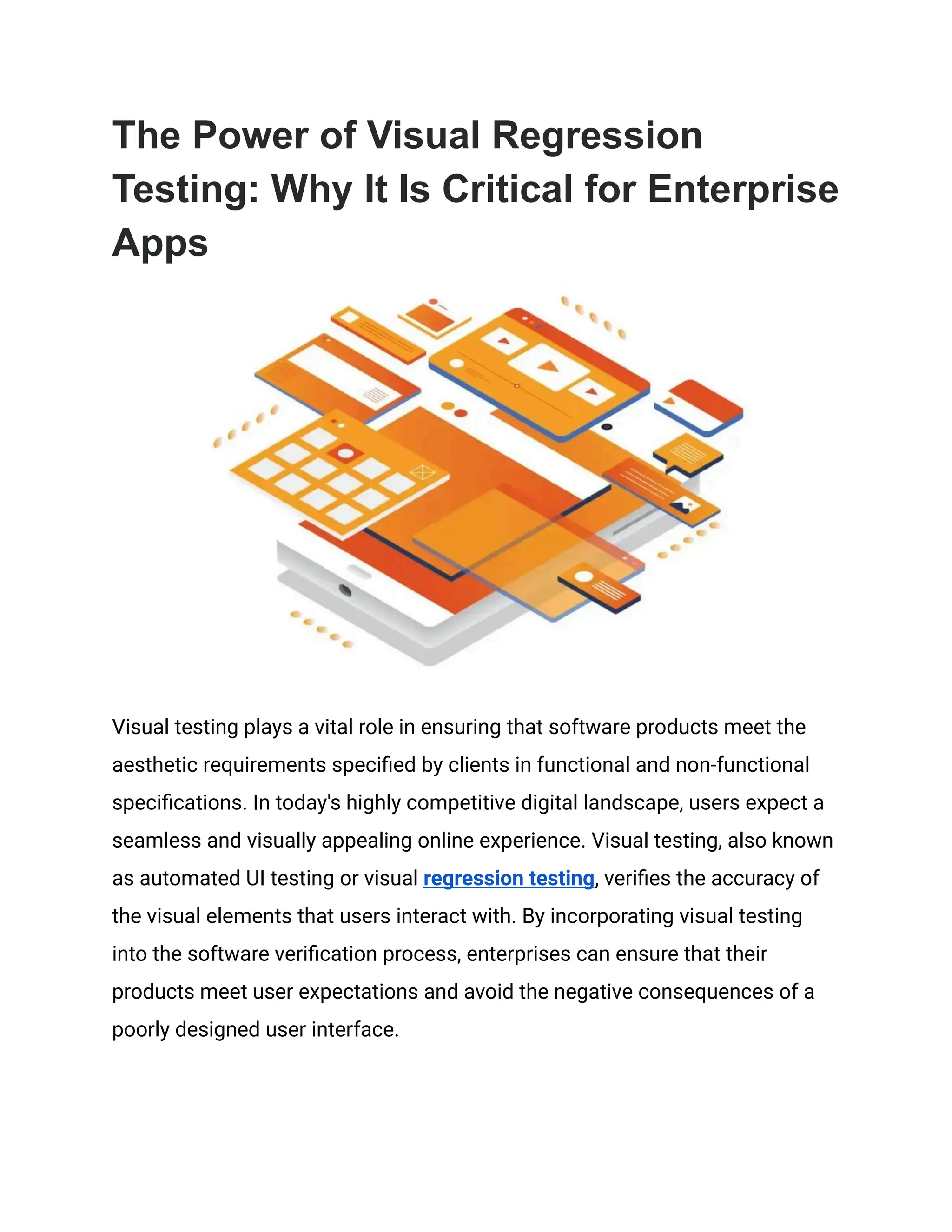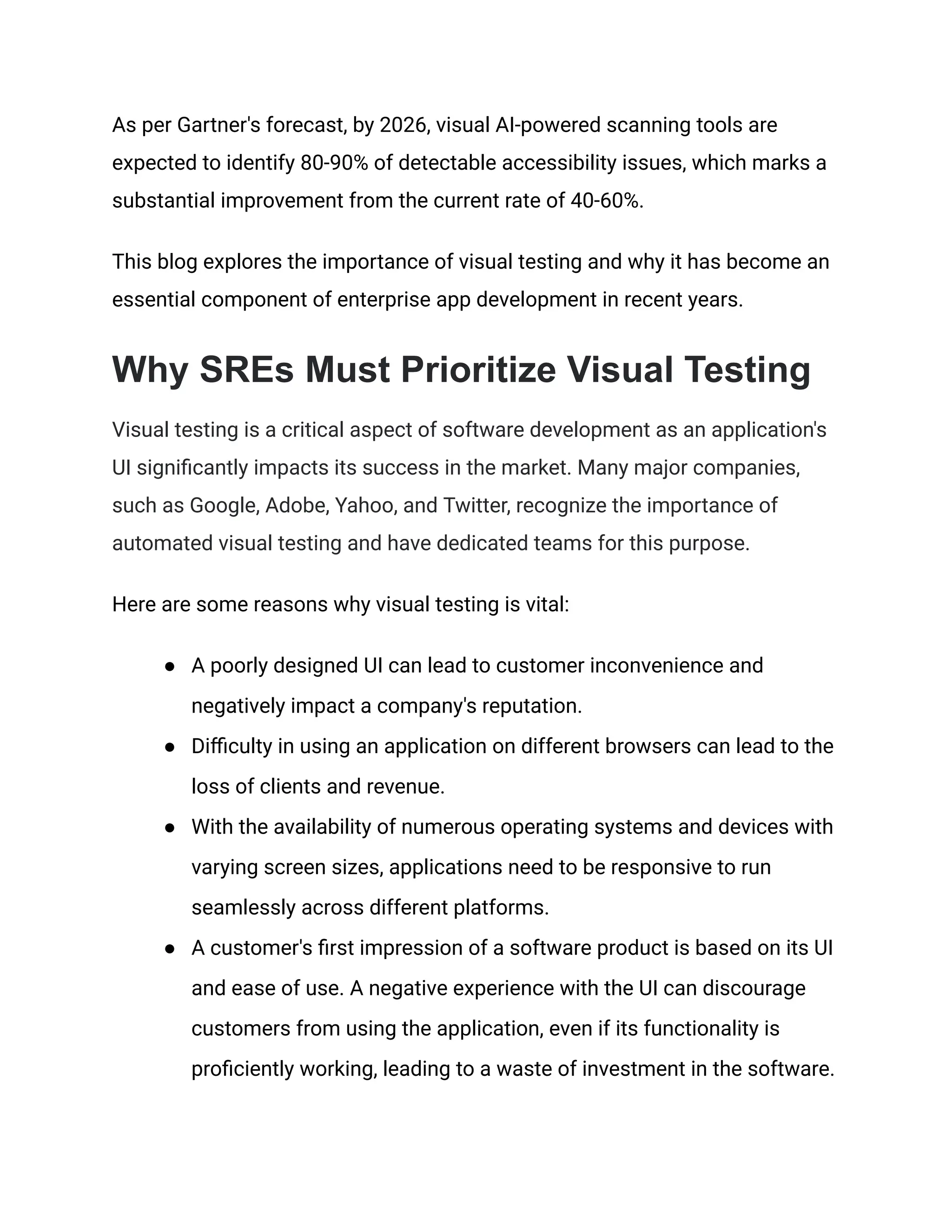 Visual regression testing is essential for ensuring software interfaces meet aesthetic and functional requirements, enhancing user experience in a competitive digital market. Many leading companies integrate visual testing into their development processes to prevent poor UI from affecting customer satisfaction and revenue. Automation in visual testing allows for faster, more accurate detection of discrepancies, supporting efficient app development across diverse devices and platforms.