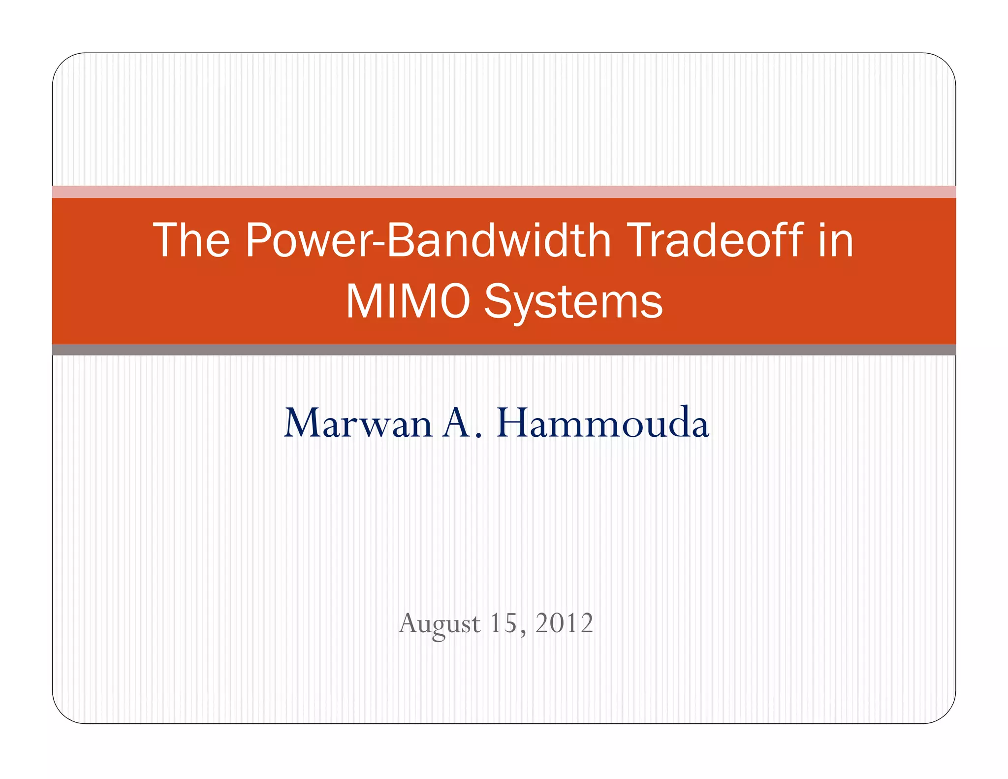 The document discusses the power-bandwidth tradeoff in MIMO systems. It begins with background on MIMO systems, including their structure and key performance improvements like spatial multiplexing gain and diversity gain. It then defines spectral efficiency and energy efficiency, noting that maximizing both is not possible due to the inherent tradeoff between them known as the EE-SE tradeoff. The concept of this tradeoff is explained through mathematical formulations. As an example, the EE-SE tradeoff for an AWGN channel is shown. Approximation methods for determining the EE-SE tradeoff in MIMO systems are also presented.