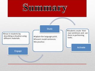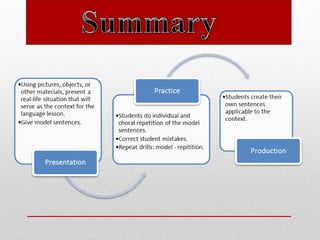 The document describes two language teaching methods: PPP and ESA. PPP consists of three stages - presentation, practice, and production. It has a high level of teacher talking time and encourages accuracy over fluency. ESA provides more flexibility by allowing movement between stages and emphasizes student-led grammar discovery. It aims to engage students emotionally and get them using language communicatively through study and activation stages. According to the source, ESA lessons can follow three procedures: straight arrow, boomerang, or patchwork.