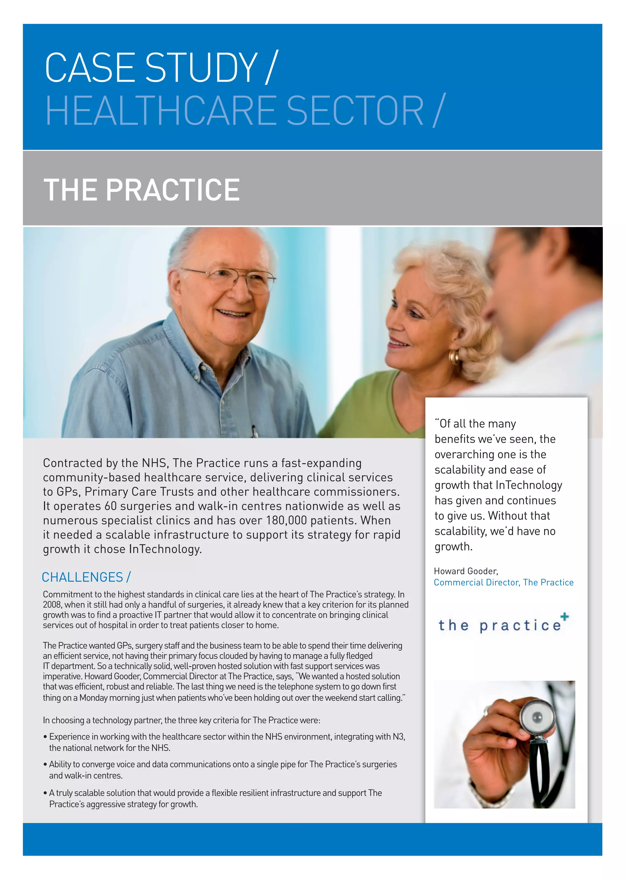 The Practice is a growing healthcare provider contracted by the NHS to deliver clinical services. It operates 60 surgeries and clinics across the UK. When planning for rapid expansion, The Practice chose InTechnology as its IT partner to provide a scalable infrastructure. InTechnology implemented a secure managed network integrating voice and data. This flexible solution has supported The Practice's growth to 60 locations. The scalability provided by InTechnology has been key to enabling The Practice's expansion and improving patient care.
