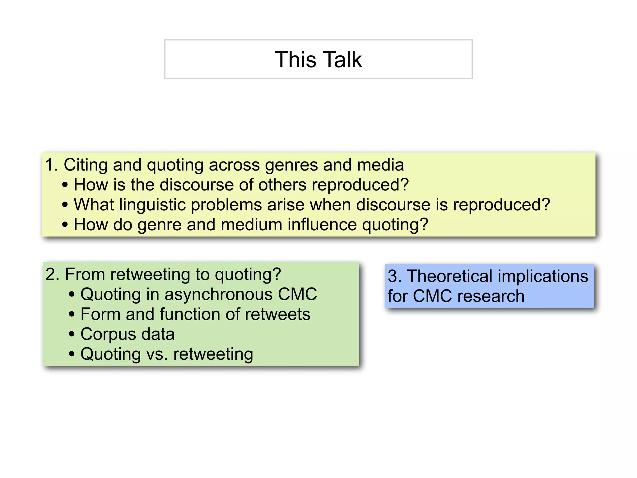 The document discusses how discourse is reproduced across different media, focusing on quoting and retweeting on Twitter. It provides examples of direct quotes, indirect quotes, and retweets from a corpus of tweets by academics. It analyzes the common pragmatic features of retweet comments, such as evaluative expressions. The document concludes that quoting practices are extended through new technologies and that retweets on Twitter tend to be short, direct, emotive, and a form of social engagement rather than formal argumentation.