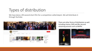 The document outlines the key requirements and processes for a short film production. It discusses types of distribution platforms, potential sources of financing, requirements for equipment, locations, legal clearances, and managing production schedules and team roles. Regulations bodies like Ofcom and trade unions that represent crew are also mentioned. The production team utilized college equipment, had a 6 week production schedule, and distributed their 90 second film on YouTube for a competition.