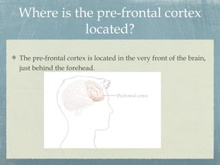 The prefrontal cortex, located at the front of the brain, is crucial for decision-making, planning, and social judgment. Studies suggest that it undergoes significant changes during adolescence, explaining reckless behaviors in teenagers due to evolving neural pathways. Damage to the prefrontal cortex can lead to drastic personality changes and impairments in ethical judgment and emotional regulation.