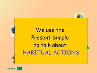 The document discusses the uses of the present simple tense in English. It provides examples of how the present simple is used to describe habitual actions of giraffes, cheetahs, dolphins, and people. It also examines the use of time expressions like everyday, on Saturdays, once a week, usually, and never to indicate frequency or lack thereof when using the present simple tense.