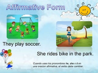 The document provides instruction on conjugating verbs in English based on subject pronouns like he, she, it. It explains that regular verbs add 's', verbs ending in certain letters like 'ss' add 'es', and verbs ending in consonant + 'y' change the 'y' to 'ies'. Examples are also given for forming questions and negatives using auxiliary verbs like 'do' and 'does' along with contractions like "don't". Common question words starting with wh- that can be used in questions are also listed.