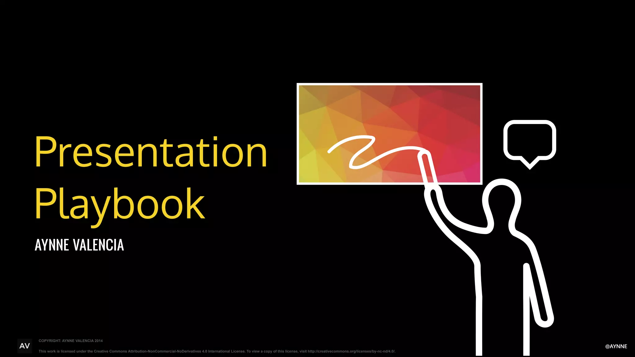 This document is a presentation playbook created by Aynne Valencia to teach creative professionals how to effectively present and sell their ideas. It covers understanding different types of presentations, stakeholders, and meetings that creatives will have. The playbook teaches the four commandments of selling ideas: know your audience, speak simply, tell a story, and make clear next steps. It provides frameworks and guidelines for different types of meetings like ideation, design iterations, and managing up to senior stakeholders. The goal is to set creatives up for success in communicating their work to different audiences.
