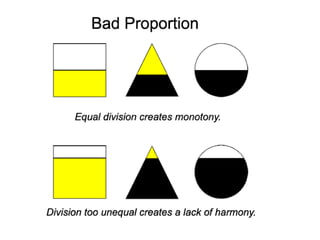 The document discusses key principles of design including proportion, balance, emphasis, movement, rhythm, pattern, harmony and unity. It provides examples of how these principles are used in artworks such as depictions of the human body by Leonardo da Vinci demonstrating proportion, self-portraits by Frida Kahlo showing different types of balance, and paintings showing movement including works by Balla, Degas, and Riley. The document examines how an artist guides the viewer's eye across an image.