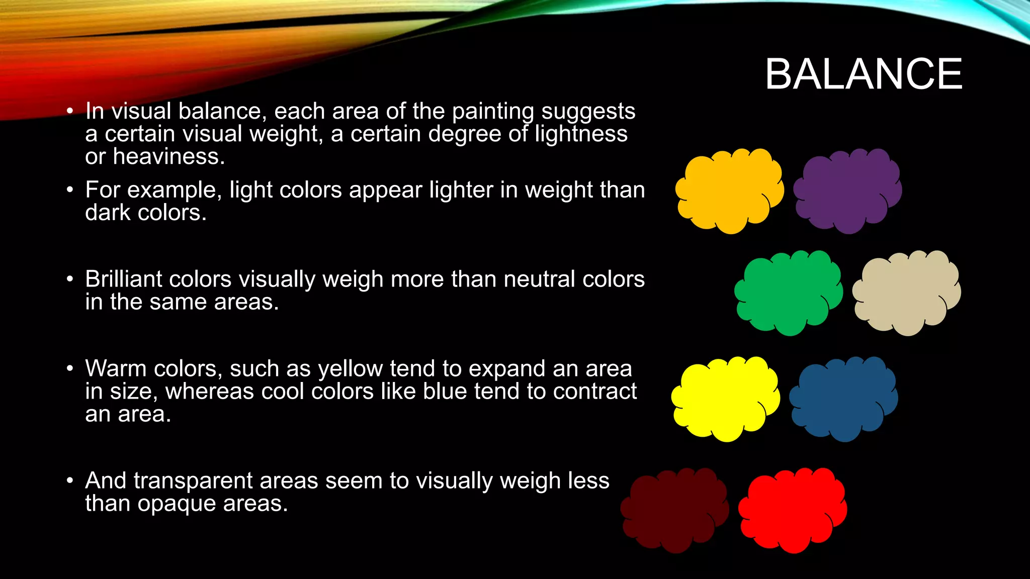 The document discusses six principles of design: balance, movement, emphasis, contrast, unity/harmony, and variety. It defines each principle and provides examples. Balance refers to the visual weight of different areas and can be symmetrical, asymmetrical, or radial. Movement guides the eye through repetition, rhythm, and action. Emphasis draws attention to focal areas. Contrast engages viewers through comparison. Unity comes from relationships among elements, while variety creates interest through changing elements like line, shape, color, value and texture. The principles work together to make art visually cohesive and engaging.