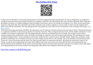 This document discusses the growing problem of electronic waste (e-waste). It begins by defining e-waste and noting that e-waste is increasing worldwide at around 8-10% annually. It then explains that planned obsolescence and the short replacement times for consumer electronics contribute significantly to the rising levels of e-waste. The document concludes by discussing methods for estimating future volumes of e-waste based on current sales figures of electronics.