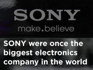 Sony was once the largest electronics company in the world due to innovations like the Walkman personal music player. However, Sony struggled due to a "Not Invented Here" syndrome where it was reluctant to adopt industry standards it did not create itself. This caused products like the Betamax video format to fail against competitors like VHS. Sony also failed to capitalize on new markets like digital music players, allowing Apple to dominate with the iPod. As a result, Sony's market value declined drastically from $100 billion to $18 billion, and it began losing billions of dollars. Sony's insular culture and failure to adapt to new standards and markets caused it to lose its dominance in the consumer electronics industry.