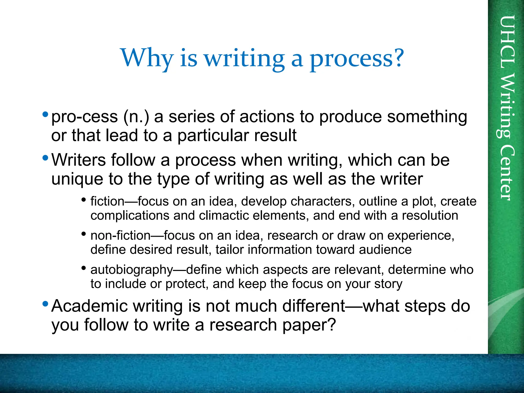 The document discusses the writing process and provides tips for writing academic papers. It explains that writing is a process that involves defining the assignment requirements, researching the topic, choosing a thesis, outlining arguments, writing drafts, and revising. Key steps include understanding the assignment, researching topic options, developing an arguable and defensible thesis, outlining arguments, conducting research, writing a draft, and revising by reorganizing, deleting unnecessary information, adding support, and editing.