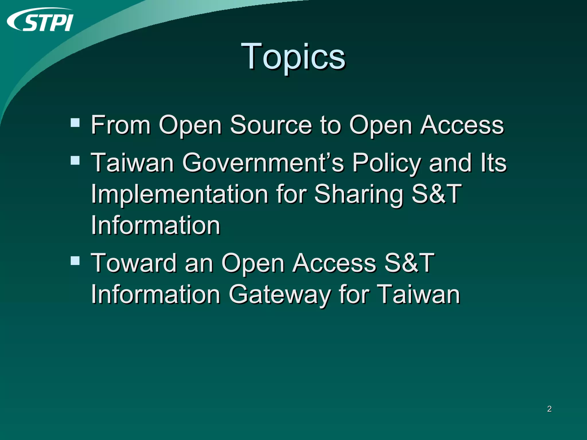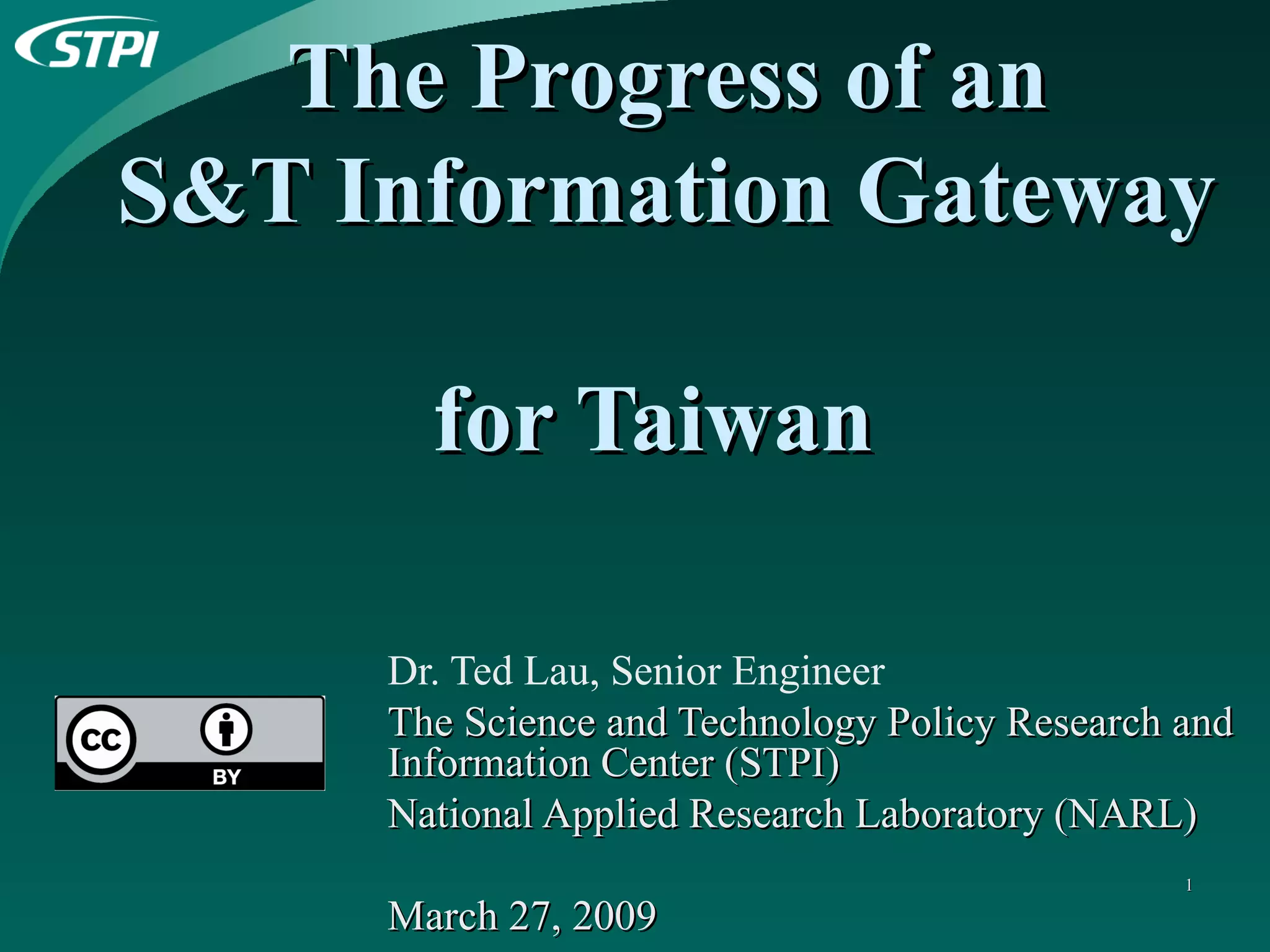 The document summarizes the progress towards establishing an open access science and technology (S&T) information gateway in Taiwan. It describes Taiwan's movement towards open source and open access models, including initiatives like Creative Commons Taiwan. It also outlines Taiwan's policies and organizations that aim to facilitate open sharing of S&T information through initiatives like the Government Research Bulletin database and CONsortium on Core Electronic Resources in Taiwan. The ultimate goal is an "integral system" as mandated by Taiwan's S&T Basic Law to create a comprehensive domestic and international S&T information network.