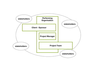 This document provides an overview of project management concepts. It discusses that projects have a definite beginning and end, and defines a project. It also outlines the five process groups that projects typically go through. Additionally, it explains the triple constraint of time, cost and scope that projects aim to balance, and introduces the nine knowledge areas of the project management framework. Finally, it emphasizes the importance of an integrated approach to managing all aspects of a project.