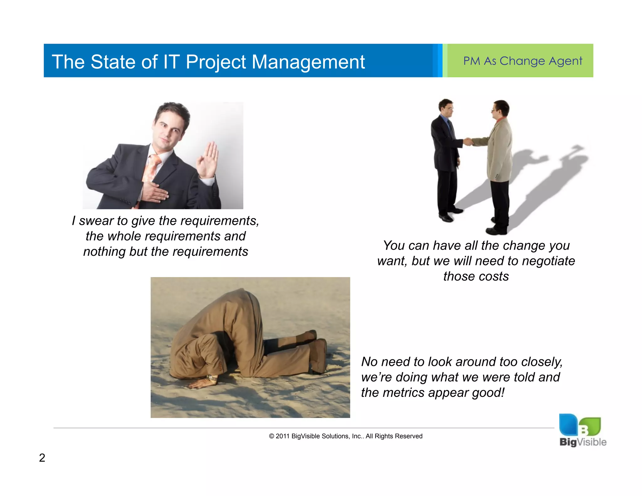 The document discusses the role of the project manager as a change agent. It summarizes that project managers are often stuck in the middle, trying to balance the structured needs of a project with the fluid and changing realities of organizational dynamics. It suggests that to be an effective change agent, a project manager must lead changes to processes and culture in order to fully meet customer needs and priorities.