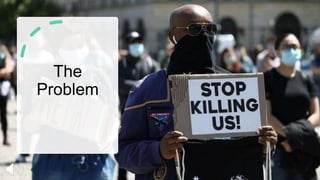 This document discusses police abuse and proposes solutions. It notes that African Americans are more likely to be fatally shot, pulled over, arrested for drug crimes, and imprisoned. The origins of policing in the US stem from slave patrols and enforcing Jim Crow laws. Community stakeholders that can help address the issue and ensure accountability include the Department of Justice, Congress, law enforcement agencies, community members and activists, and organizations collecting data on police misconduct. Measurable successes would be surveys showing increased community satisfaction with policing and data showing impartial use of force and fewer police complaints over time.