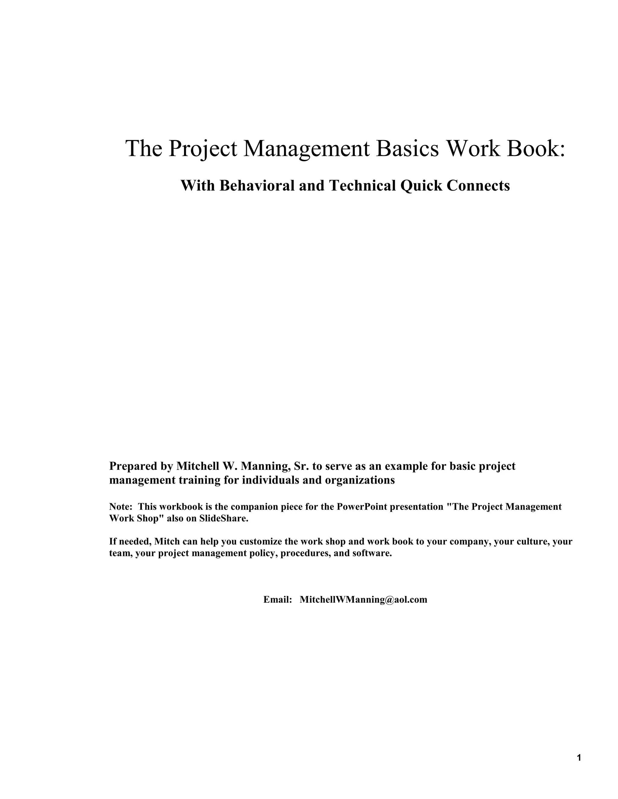 This one-page document provides an overview of a project management basics training workbook. It notes that the workbook is designed to teach project management fundamentals to new project team members. It will cover both technical and behavioral aspects of project management through lessons in each of the five stages of a project life cycle from initiation to close. The workbook aims to help participants more effectively contribute to and lead project work by understanding roles, responsibilities, and best practices.