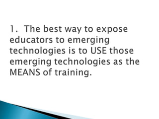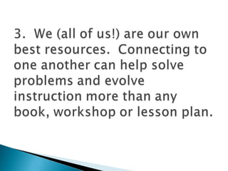 Staff development that improves student learning organizes teachers into collaborative teams focused on school and district goals. Effective leaders guide continuous curriculum improvements and provide resources for teacher collaboration and development. Data is used to identify priorities and monitor progress, while research informs decision making. Training applies principles of human learning and uses strategies appropriate for goals, equipping teachers with collaboration skills while deepening content knowledge and repertoire of instructional strategies. Outreach prepares teachers to engage families in student achievement.