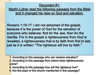 Martin Luther posted 95 theses criticizing the Catholic Church's sale of indulgences and other abuses on the door of the Wittenberg Church in 1517, sparking the Protestant Reformation. Luther argued that salvation comes through faith alone, not works or indulgences, and he translated the Bible into German so ordinary people could read it. His writings spread rapidly and attracted many followers, though the Catholic Church condemned Luther and his teachings. The Reformation led to divisions in Christianity between Protestantism and Catholicism that still exist today.